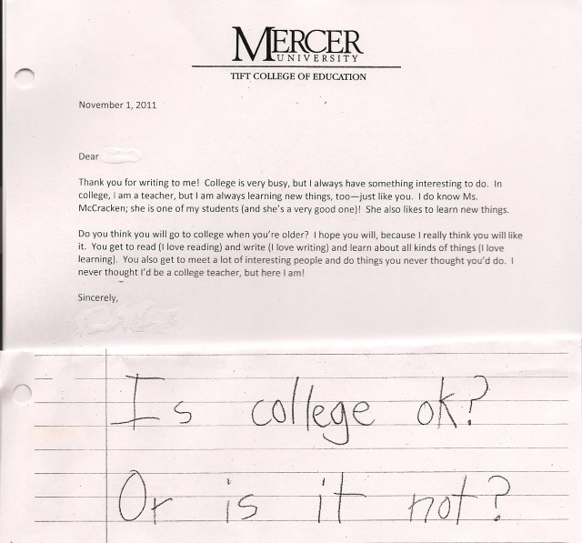 I chose this portion of a child’s letter, because it is the same question I have been asking myself since the summer. Also, anyone I know who is in graduate school, for education, has verbalized these same questions. I particularly enjoy how my professor changed her “discourse” to match the level of the student. Oh…I just used a term from class. (I won the fight with the white-out bottle as I covered the names of my student and professor.)
